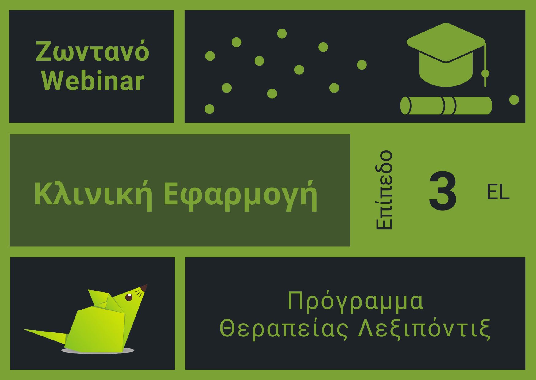 Η εκπαίδευση στο Επίπεδο 3, “Κλινική Εφαρμογή” του προγράμματος Λεξιπόντιξ, υλοποιείται ως ολοήμερο, σύγχρονο (ζωντανό), αλληλεπιδραστικό διαδικτυακό σεμινάριο ή ως δια ζώσης εργαστήριο.